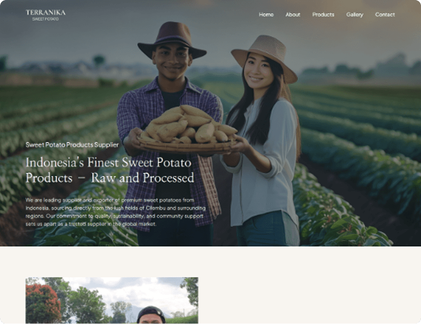 Export site for premium Indonesian sweet potatoes focused on quality, sustainability, and farmer support.